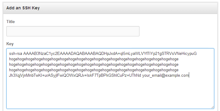 $ cat ~/.ssh/github_id_rsa.pub ssh-rsa AAAAB3NzaC1yc2EAAAADAQABAAABAQDHpJxdA+ql5mLyaWLVYf7iYp21gSTRVsVNeHicypuG hogehogehogehogehogehogehogehogehogehogehogehogehogehogehogehogehogehogehogehoge hogehogehogehogehogehogehogehogehogehogehogehogehogehogehogehogehogehogehogehoge hogehogehogehogehogehogehogehogehogehogehogehogehogehogehogehogehogehogehogehoge Jh3XqjVjnMnbTwKI+urASyjIFwiQOWxQRJv+lskF7TpBPkGShlCuPz+UThNd your_email@example.com